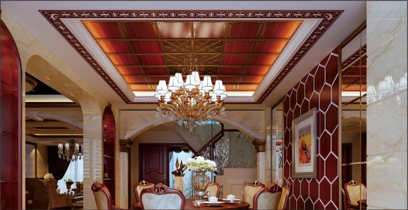 文化交融的艺术结晶,自然主义和抽象装饰特质有机结合的美感。以线条和典雅的单色为基础,继承了罗马文化的建筑技巧。在整个吊顶美感展现中,色彩和线条始终的是整体布局的重要组成。